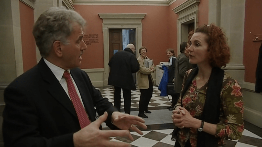 Most of all, though, the politicians’ naivety in Mais im Bundeshuus betrays a vacuum for a new kind of politics, one which explicitly harnesses the audiovisual as a tool for sensationalism and polemics. The documentary’s release in the latter half of 2003 coincided with a crucial moment in recent Swiss politics: the election to the Federal Council of Christoph Blocher, the infamous nationalist firebrand.