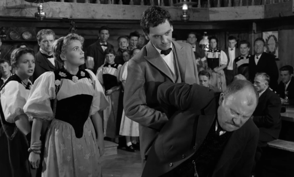 It’s something like the climax of the film, although it’s more like the conflation of the two storylines: the hero of the romance narrative (Felix) faces down the antagonist of the cheese factory narrative (Egli Hannes) at the village Wirtschaft.